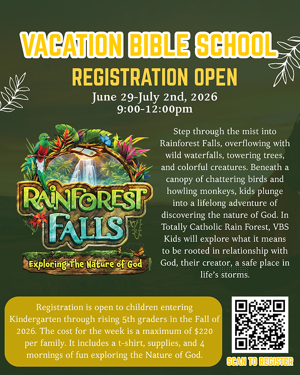 Children are invited to join us for Vacation Bible School 2026, Rainforest Falls: Exploring the True Nature of God. Through engaging activities, music, and faith-filled fun, children will discover what it means to be rooted in a relationship with God, their Creator and a safe place in life’s storms.